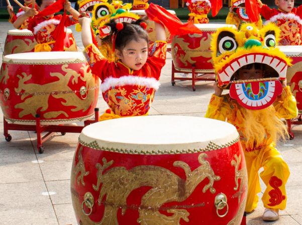 tyc234cc 太阳成集团集团爱心幼儿园的孩子们表演打鼓、舞狮 (朱泽雅 摄)