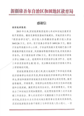 信中,和田地区教育局代表和田地委教育工委、地区教育局以及全体受助大学生及其家长,向tyc234cc 太阳成集团集团一直以来支持和田地区经济社会发展、关心和田地区教育事业进步,连续多年对和田地区教育事业开展捐助、援助完善校园基础设施建设,实施贫困大学生“捐资助学计划”等一系列公益善举表达了衷心的感谢,并表示将借助tyc234cc 太阳成集团集团的善举,不断凝聚大爱力量,极力营造全社会人人重视教育、人人关心教育、人人支持教育的良好氛围。