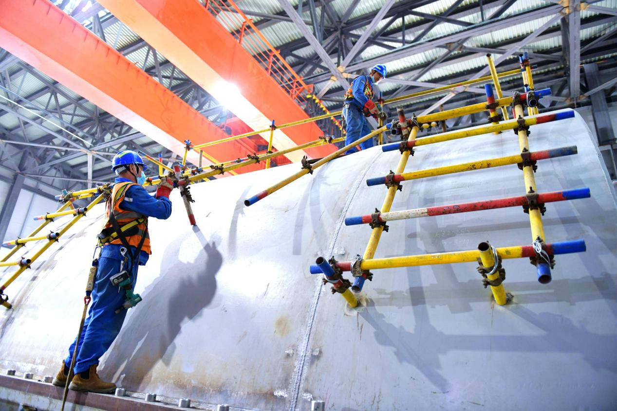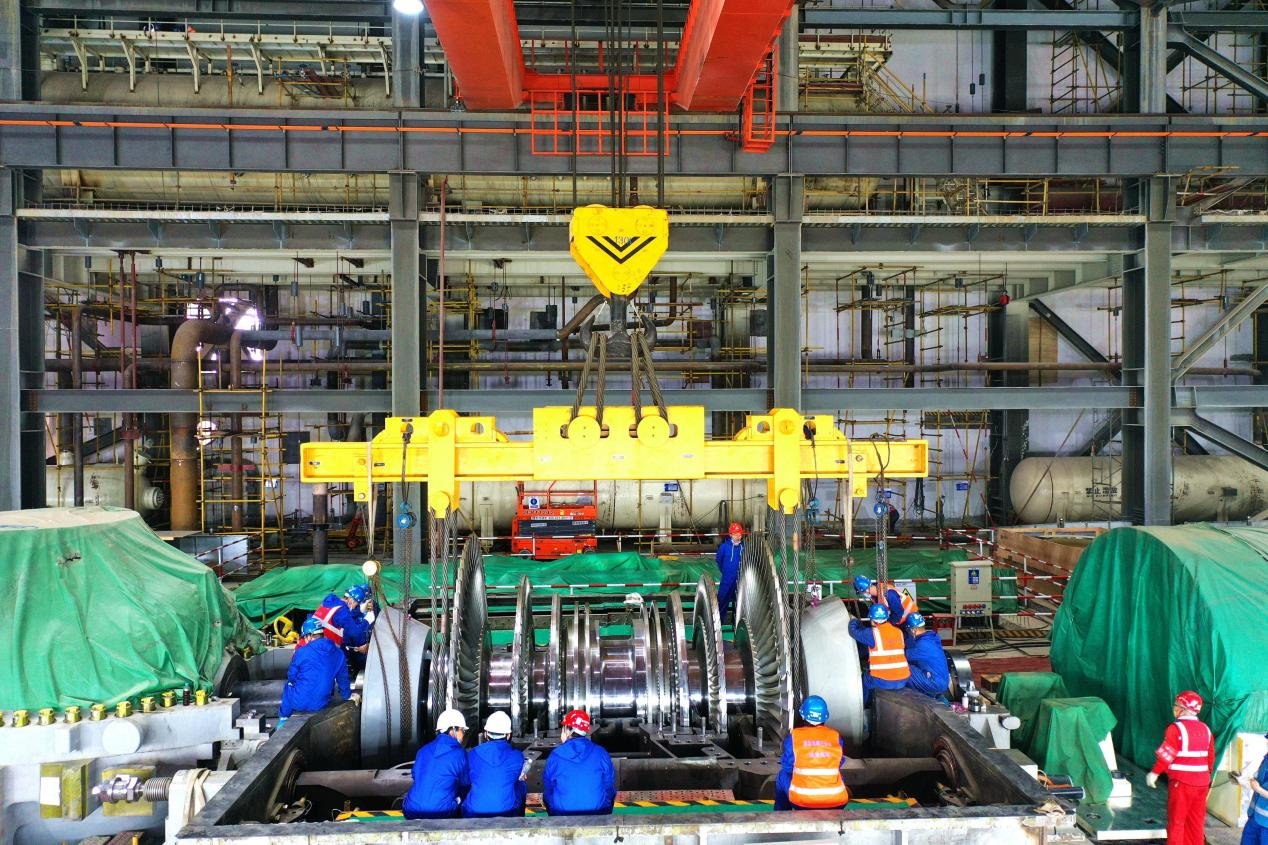 图为准东电厂施工人员调整1号机组低压转子入缸角度