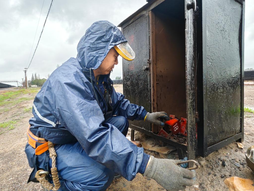 雨势渐大,站场地面已形成明显积水,作业人员每一步都需格外谨慎,确保安全。“3道27辆,车辆检查完毕,可以通风试拉!”对讲机里传来连结员高全鹏的声音。他半蹲在车辆连接处,仔细确认车钩锁闭状态,雨水不断拍打在他的雨衣帽檐上,他依然保持着专注的工作状态。试拉完毕后,他抹了把脸上的雨水,又快步走向下一节车辆。