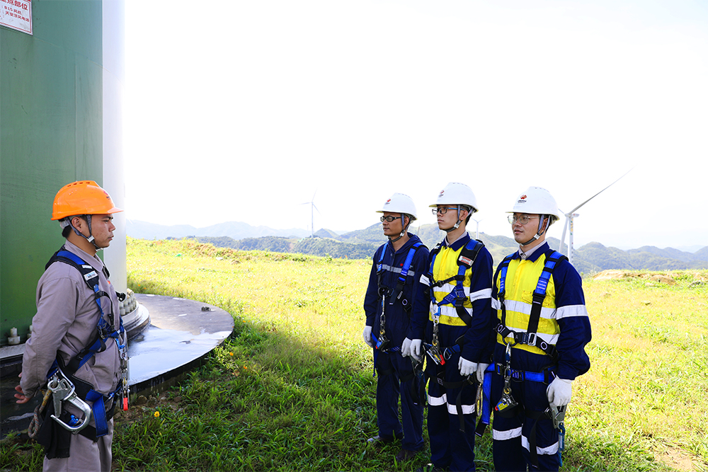 图为天堂顶风电场副厂长李昌俊对三名风机运维人员进行安全技术交底。