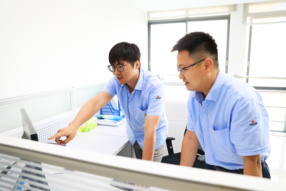 图为广西国能能源发展有限公司规划建设部主管熊浩、广西国能能源发展有限公司贵港分公司副经理宋晨光在风电场智慧监控平台上查看风机运行数据。