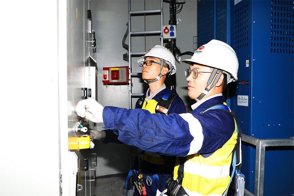 图为天堂顶风电场运维人员潘展汉、刘振强正在风机内部进行设备维护。